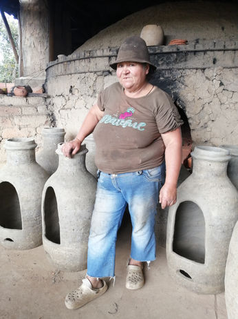 A las afueras del pueblo, camino al desierto de La Candelaria, hay muchas chimeneas de hornos de carbón que indican la presencia de un centro alfarero. Buscando las chimeneas de la zona, conocí a Gloria Valero. Ella hace chimeneas de barro con una técnica muy parecida a la del velón de Juana Sánchez, con algunas diferencias y variaciones. Su arcilla es color arena cuando está cruda, y la mezcla con arena de la quebrada cercana, para darle mayor resistencia al choque térmico a sus piezas. Arma la base con el puño de la mano y luego empieza a enrollar las paredes gruesas entre sus manos. Para sus chimeneas, Gloria busca la arcilla y la arena de un lote cercano a su finca, y con su mula las acarrea hasta su casa. Por estar expuestos a fuego directo, estos hornos necesitan una buena cantidad de arena dentro de su mezcla arcillosa, para aguantar el choque térmico. Una máquina le ayuda a Gloria a mezclar muy bien su pasta.